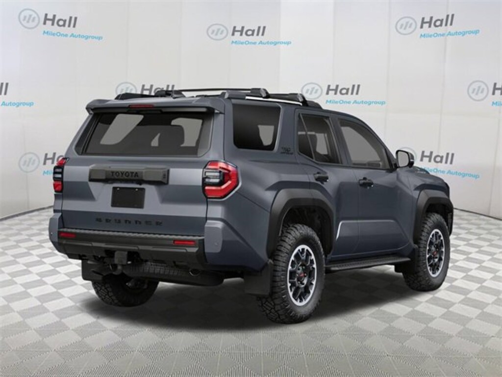 - Black honeycomb-style grille, mirror caps, door handles, and overfenders color-keyed rear spoiler black 'TRD OFF ROAD' and '4RUNNER' badges